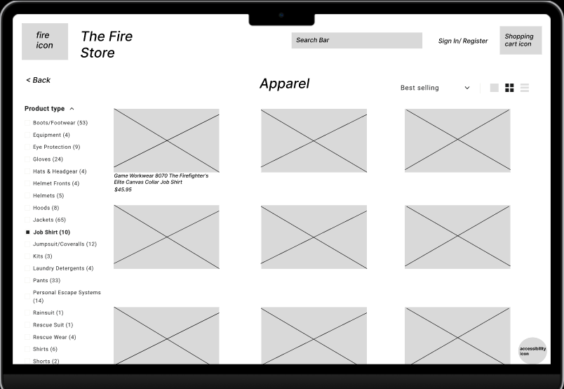 To better understand our target audience, I developed a user persona named Jake—a dedicated Firefighter who enjoys purchasing firefighting apparel and gear from reputable companies. While generally satisfied with the website, Jake finds the current layout and selection process cluttered and difficult to navigate. Through this persona, I identified key areas for improvement, such as streamlining navigation and incorporating filtering options and a quick pay option for fast checkout. These insights guided the design enhancements to ensure the app meets the needs of users like Jake, who value efficiency and ease of use.